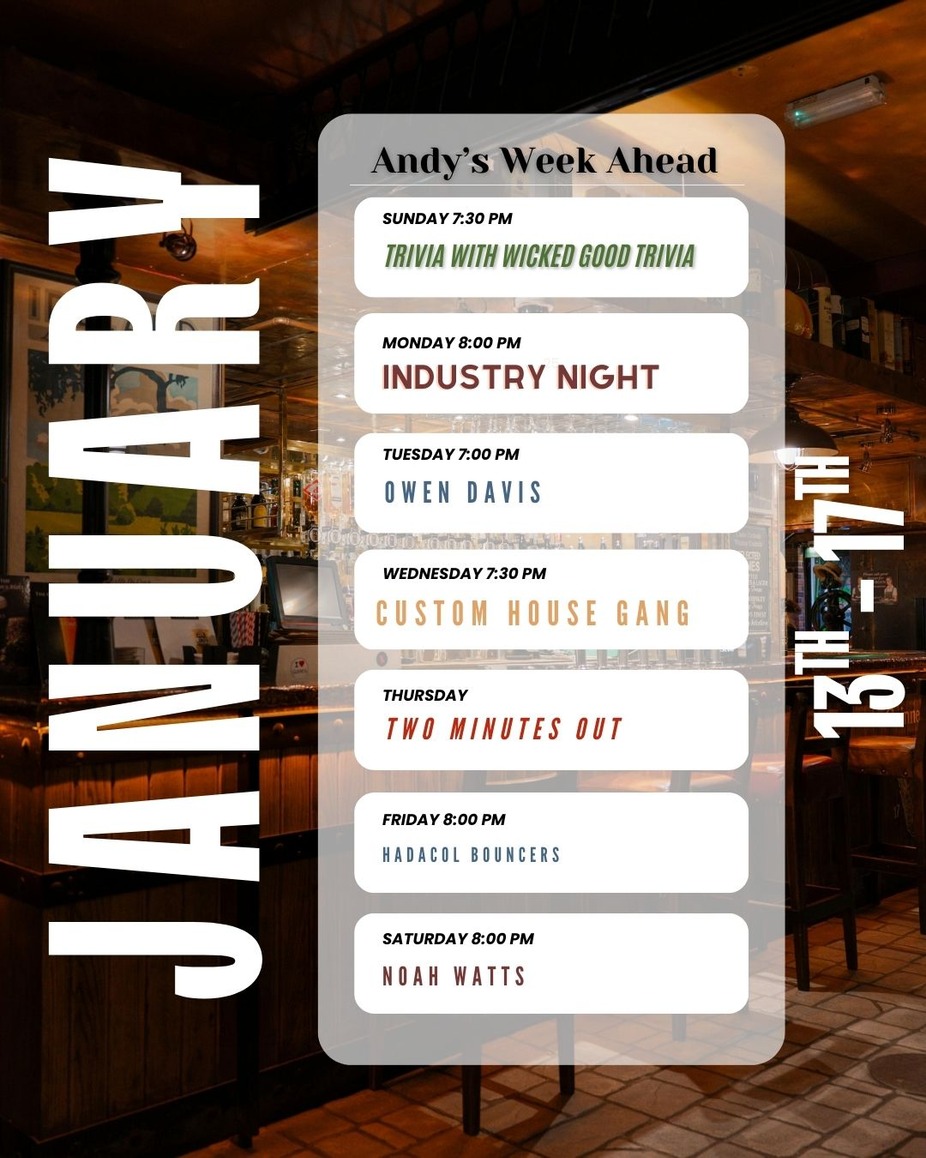 Every Wednesday the Custom House Gang, Portland's finest seasoned musicians, take the stage at Andy's Old Port Pub! This band of old friends brings an eclectic blend of Americana - where folk, blues, country, and jazz collide in the best kind of way. With rich harmonies, well-worn instruments, and stories woven into every tune, they don't just play music - they create a vibe. Expect the laid-back musical magic that turns an ordinary night into a legendary pub memory.