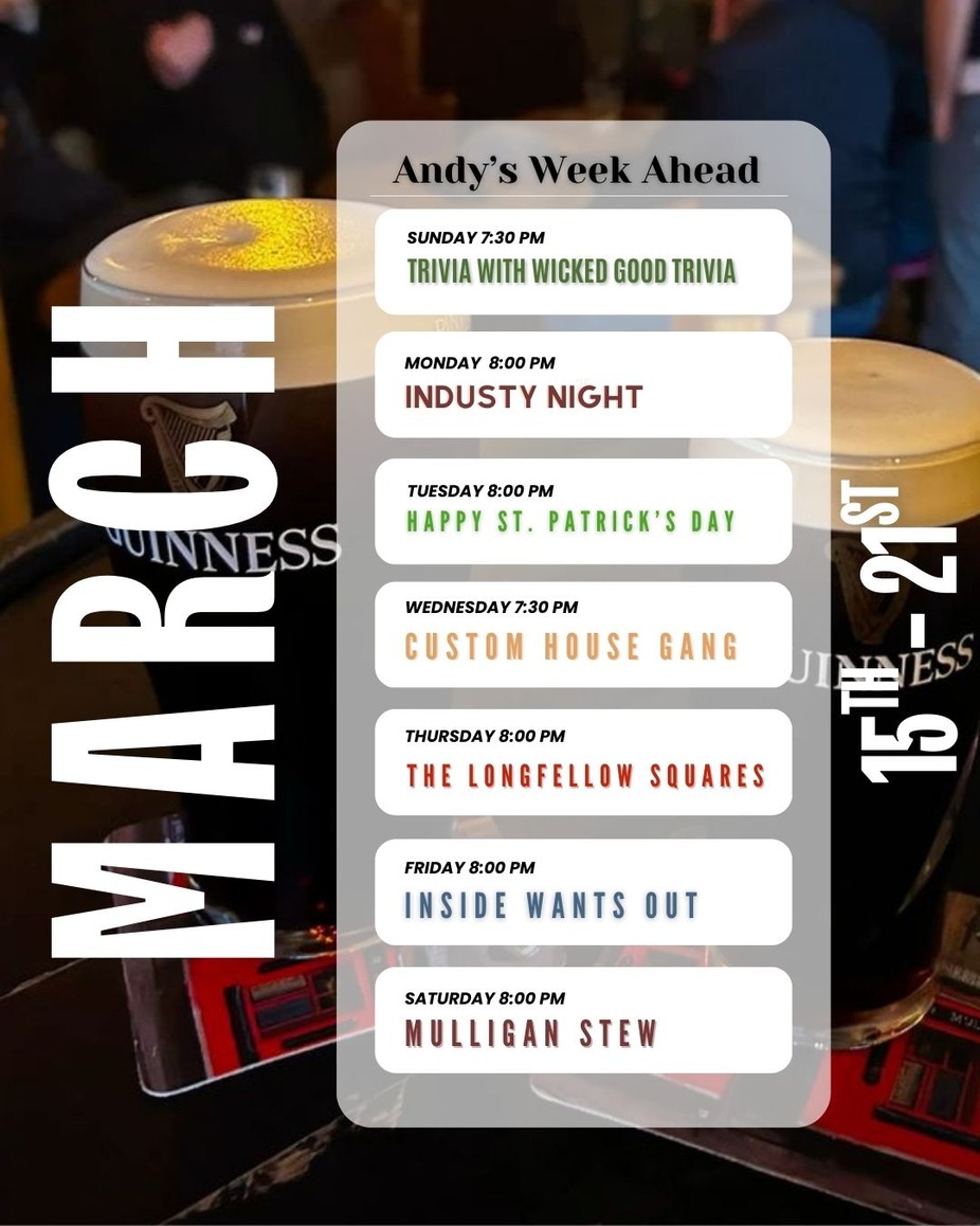 Every Wednesday the Custom House Gang, Portland's finest seasoned musicians, take the stage at Andy's Old Port Pub! This band of old friends brings an eclectic blend of Americana - where folk, blues, country, and jazz collide in the best kind of way. With rich harmonies, well-worn instruments, and stories woven into every tune, they don't just play music - they create a vibe. Expect the laid-back musical magic that turns an ordinary night into a legendary pub memory.
