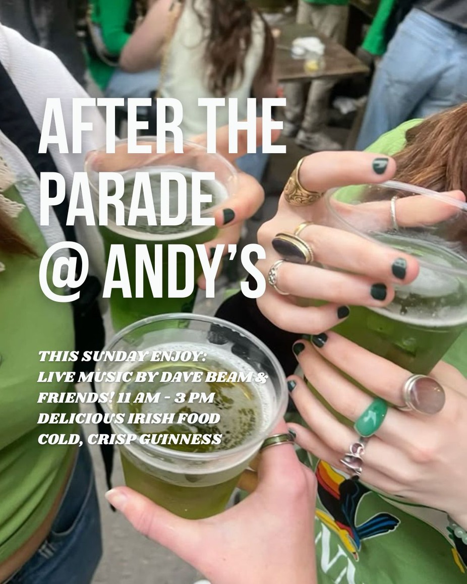 Live Music all night long @ Andy's! Acoustic 6 PM -7: 30 PM. Electric 8 PM -12 AM. Make sure to dress in green! 🍀